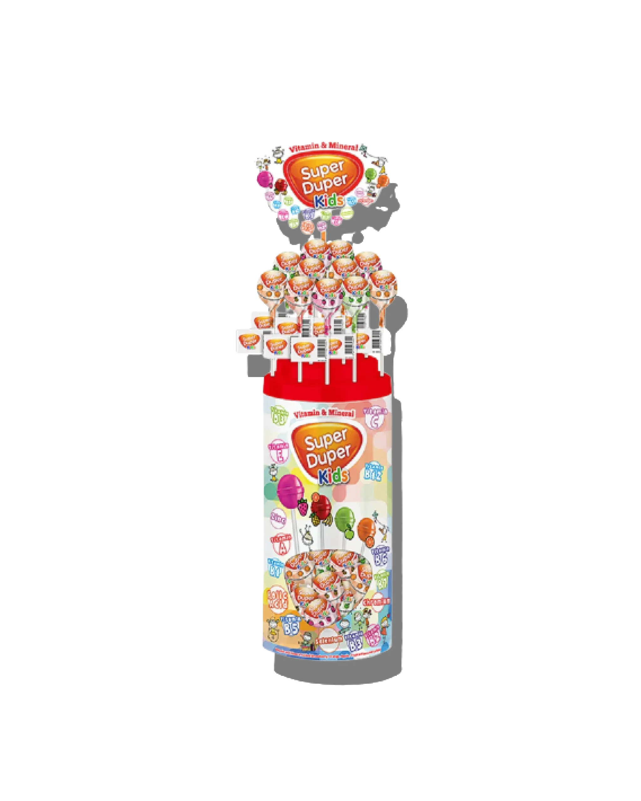 Super Duper Kids Lollipops with Vitamins & Minerals provide children with a tasty treat that supplies over 25% of their daily vitamin needs. Each lollipop is enriched with essential nutrients to support children’s health.