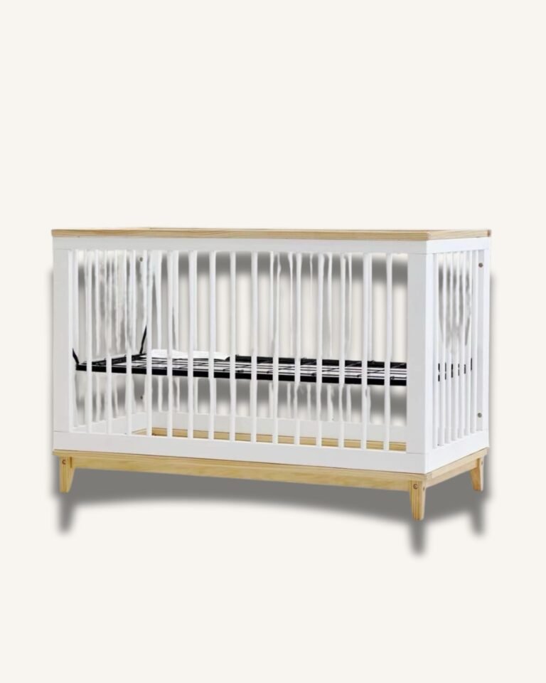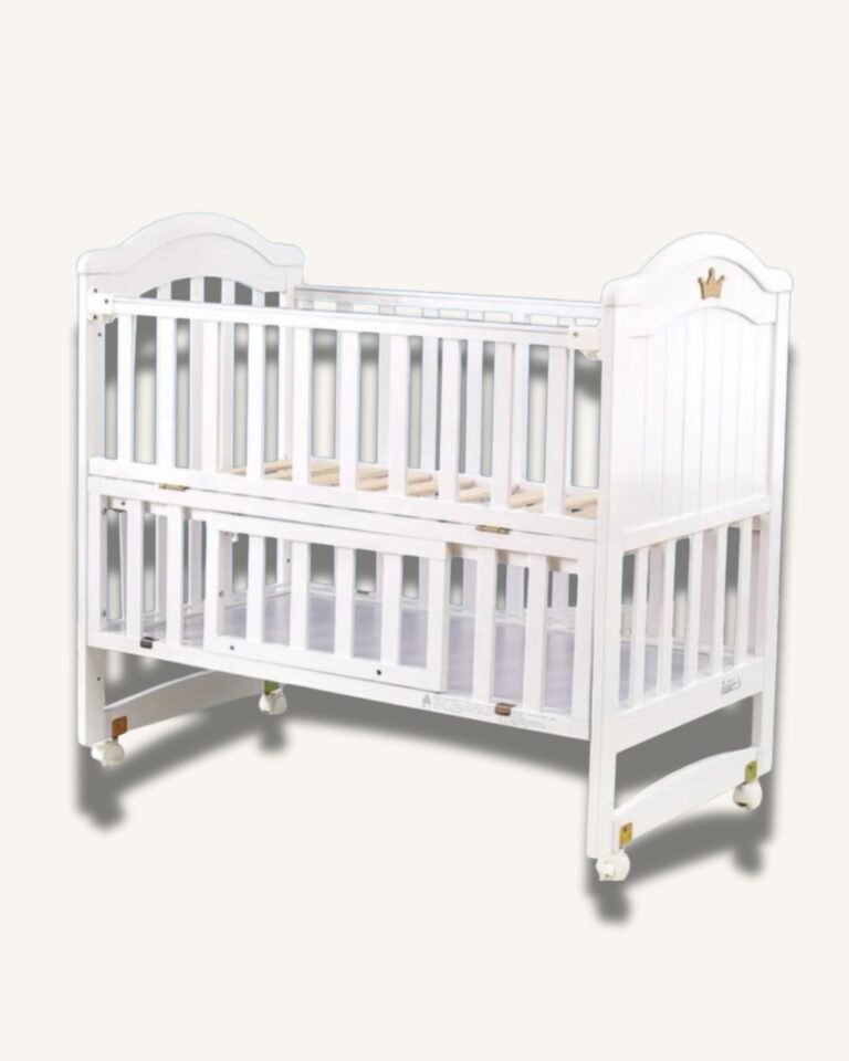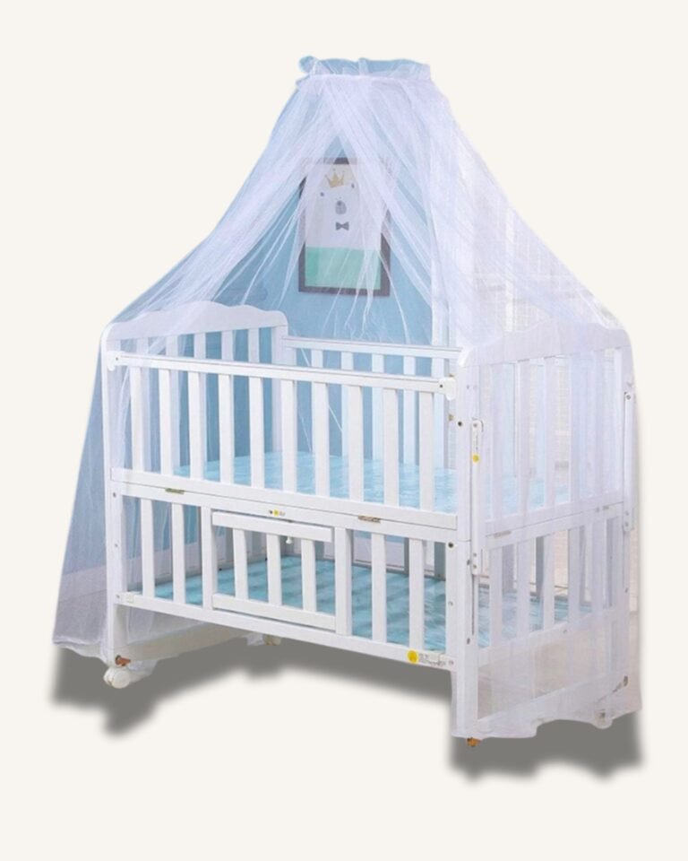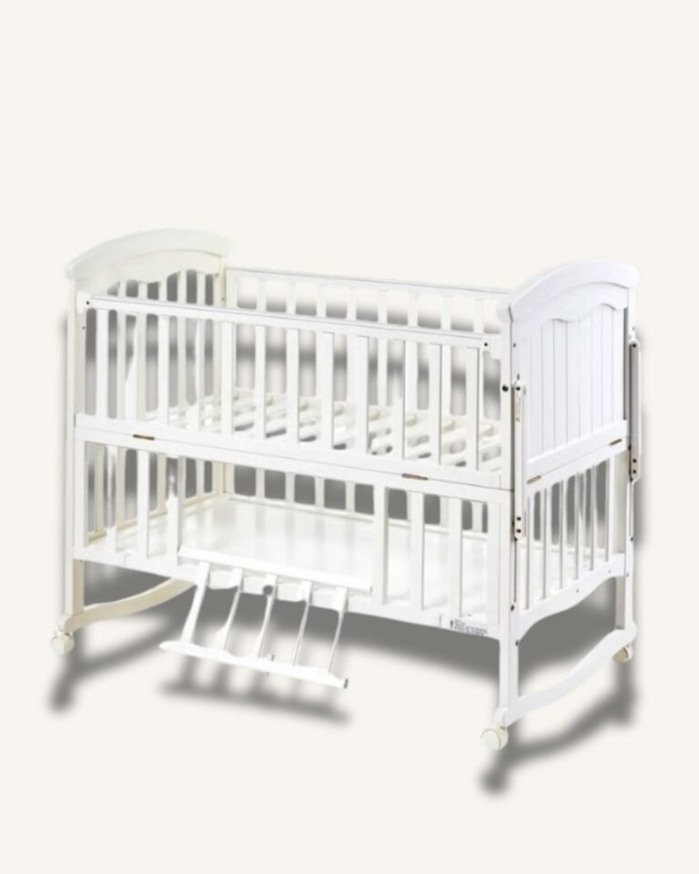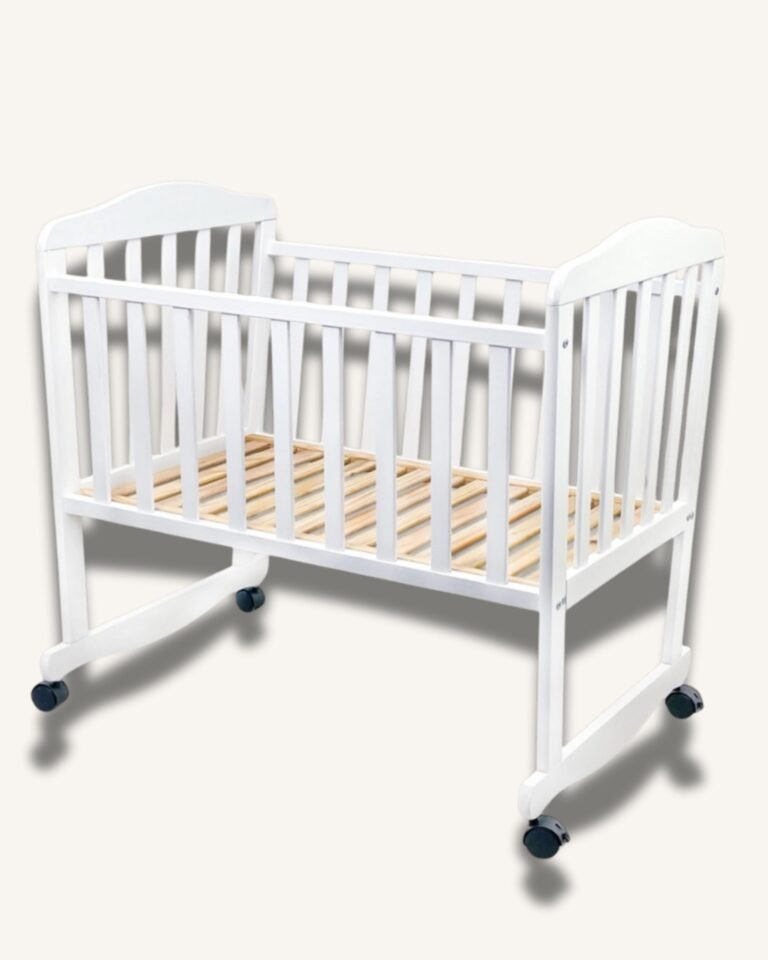 Wooden Baby Bed Model 885 features a sturdy wooden frame designed for long-term infant use, providing a stable and secure sleeping environment.