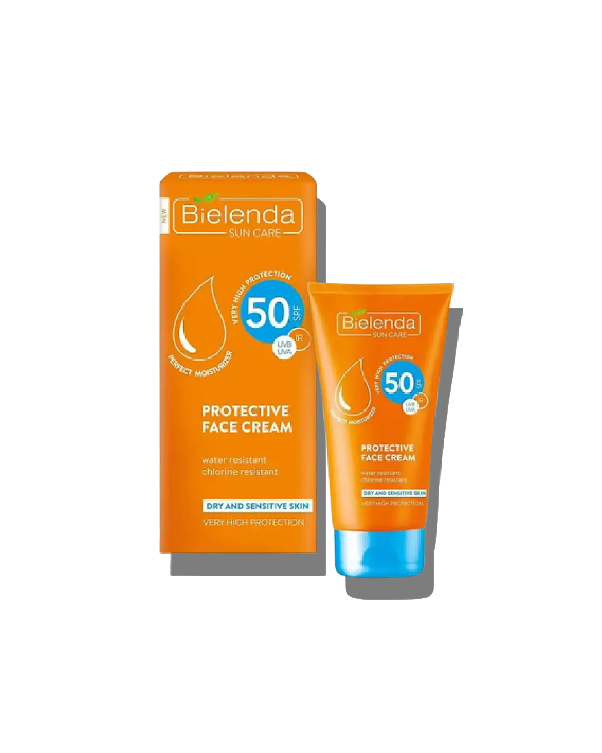 Bielenda SPF50 Protective Face Cream is a lightweight, fast-absorbing sunscreen providing broad-spectrum UVA and UVB protection to prevent sun damage and premature aging.